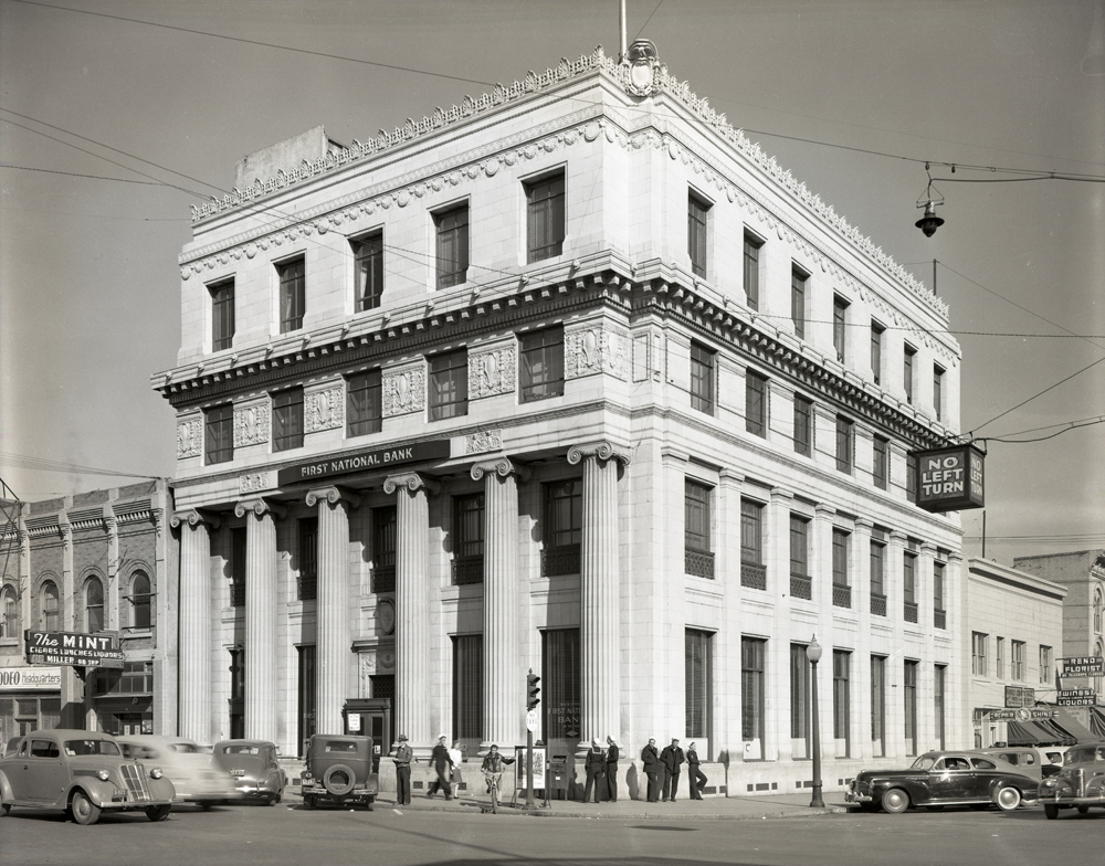 When the institution's name changed from Reno National to First National Bank, the original name, incised into the terra cotta above the columns, was covered by a new, modern sign.