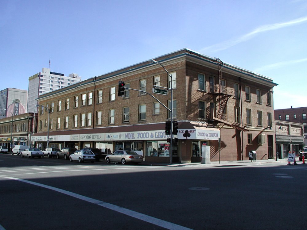Historic structure ID: 1050 | This file appears in: Senator Hotel Photographed in 2004, the Senator Hotel retained its classic lines, with a block-length canopy obscuring its high ground-floor storefront windows and arched mid-block entrance. | Creator: Max Chapman | Date: 2004 Download Original File CreatorMax ChapmanDate2004 "Historic structure" appears in: Senator Hotel