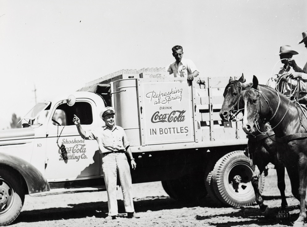 A Shoshone Coca-Cola Bottling Company delivery truck driver greets a pair of cowboys on horseback, possibly during the Reno Rodeo.