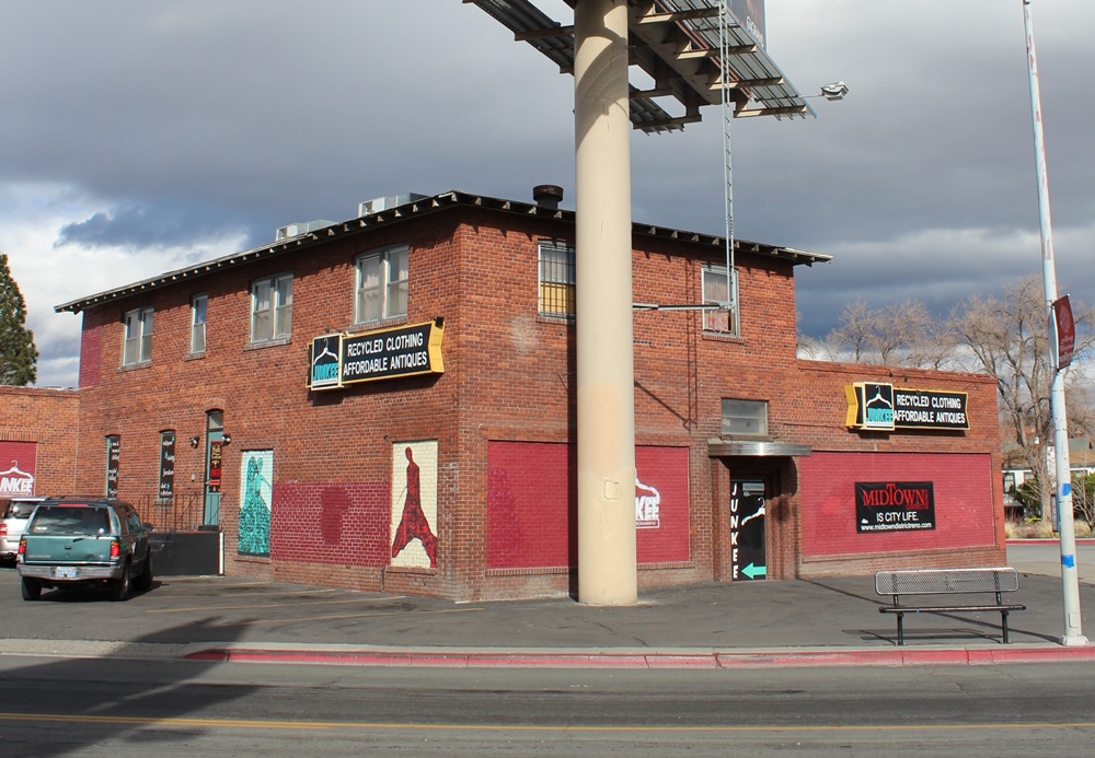 Junkee Clothing Exchange first occupied the building in 2008, after Resco Restaurant Equipment & Supply moved to East Plumb Lane. The windows on the south facade, the longtime front entrance to Shoshone Coca-Cola, have been covered over. | Creator: Alicia Barber | Date: 2015Download Original File