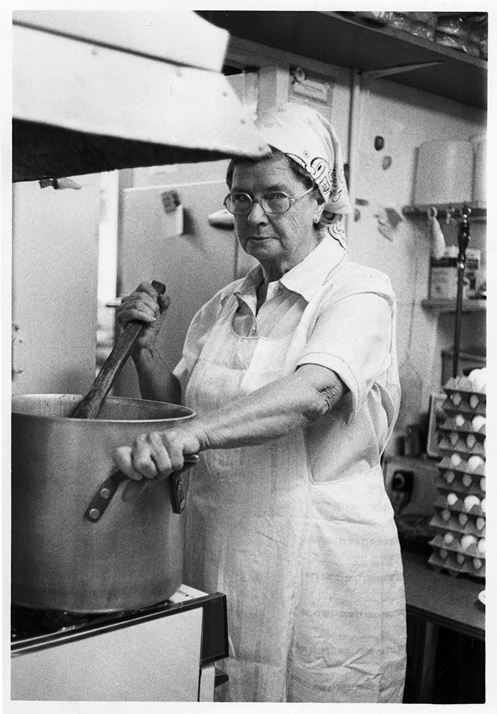 Minnie Presto, a 15-year veteran chili-maker for Landrum's when this photo was taken, guarded her secret recipe as she stirred up her 40-lb. Saturday batch.