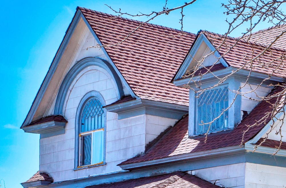 A close-up of the house's second floor reveals some of the features that make it so rare and significant: its side-gabled roof with projecting cross gables and its ornate decorative glass windows. | Creator: Emily Rogers | Date: 2016Download Original File