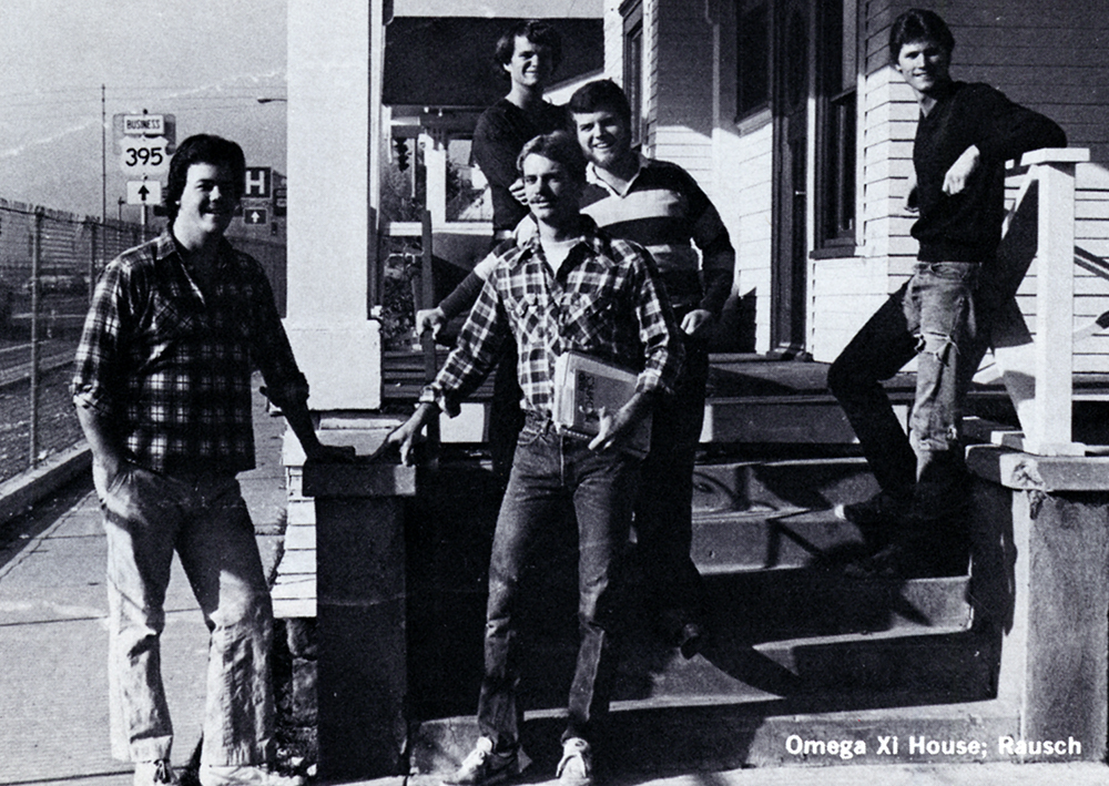 Members of the Omega Xi on the freeway-side porch of the house. The porch was later walled in and became a rental unit with a bedroom and bathroom. | Date: 1983 | Source: Artemisia Yearbook, Special Collections, University of Nevada, Reno LibrariesDownload Original File