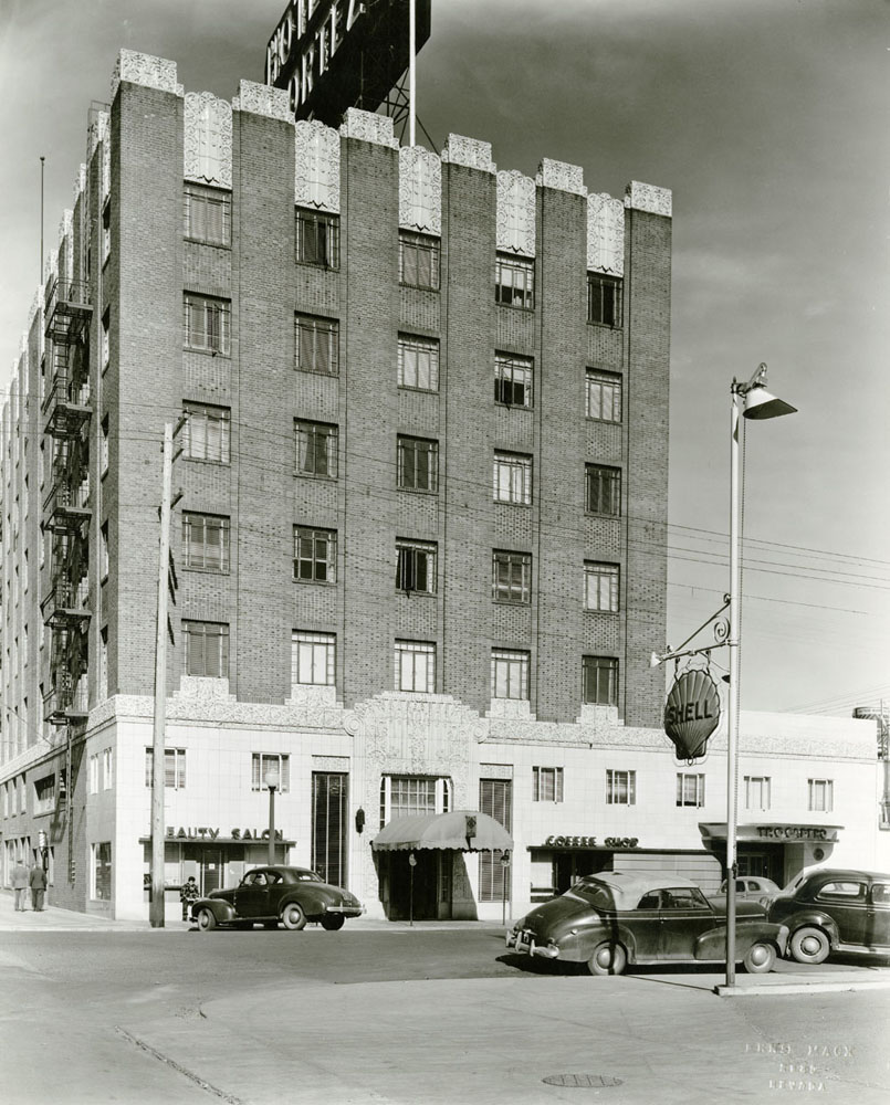 The expansion of the El Cortez was completed in 1941. In this photograph, signs for the beauty shop, coffee shop, and Trocadero can clearly be seen on the front of the building. This photograph exemplifies the geometric brickwork and decorative terracotta inserts common of Art Deco architecture. | Source: Special Collections, University of Nevada, Reno LibrariesDownload Original File