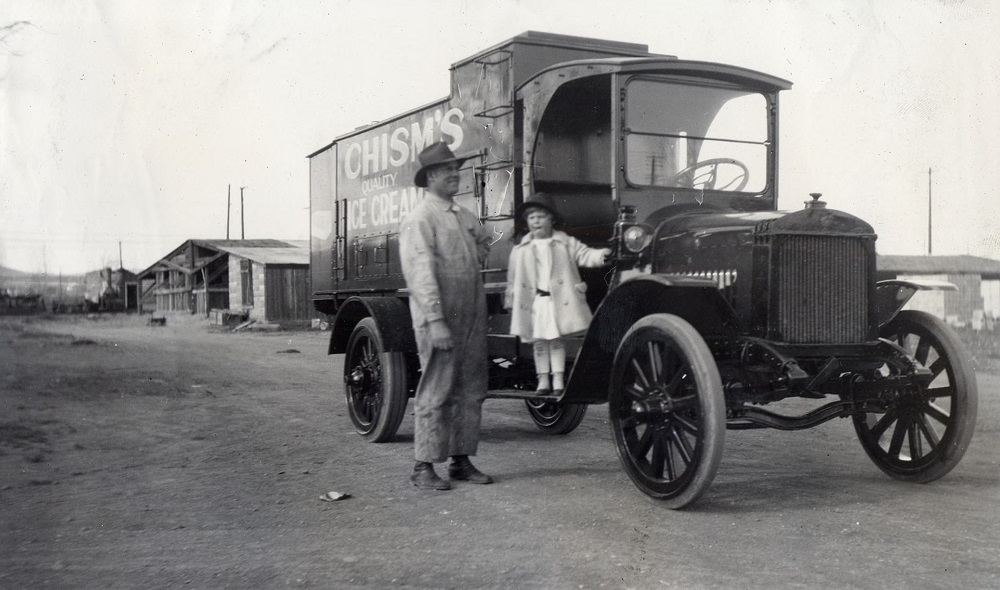 Ed and Alice Chism, 1921 ID: 1654 | This file appears in: Edward and Clara Chism House Ed Chism poses with his daughter Alice and a Chism's Ice Cream truck in 1921. | Date: 1921 | Source: Special Collections, University of Nevada, Reno Libraries Download Original File SourceSpecial Collections, University of Nevada, Reno LibrariesDate1921 "Ed and Alice Chism, 1921" appears in: Edward and Clara Chism House