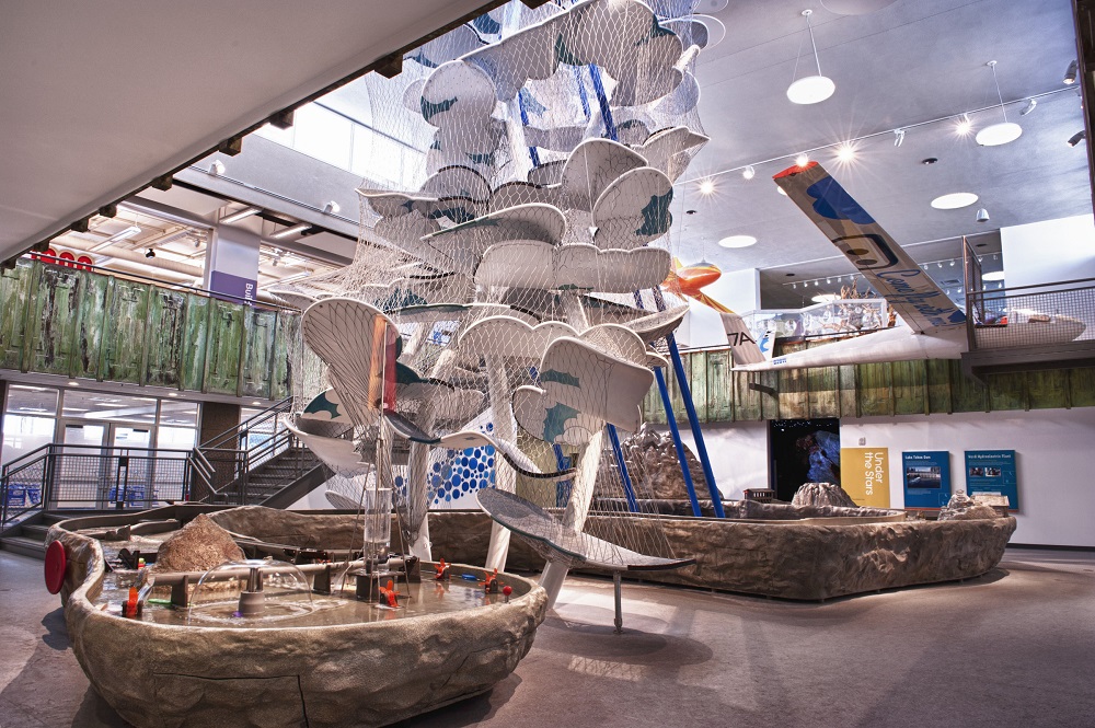 The main atrium at The Discovery is home to a number of exciting exhibits including the Cloud Climber, a three-story-tall climbing structure. Retained in the renovation was the copper paneling surrounding the entire atrium, now aged to a green patina. | Creator: Terry Lee Wells Nevada Discovery MuseumDownload Original File