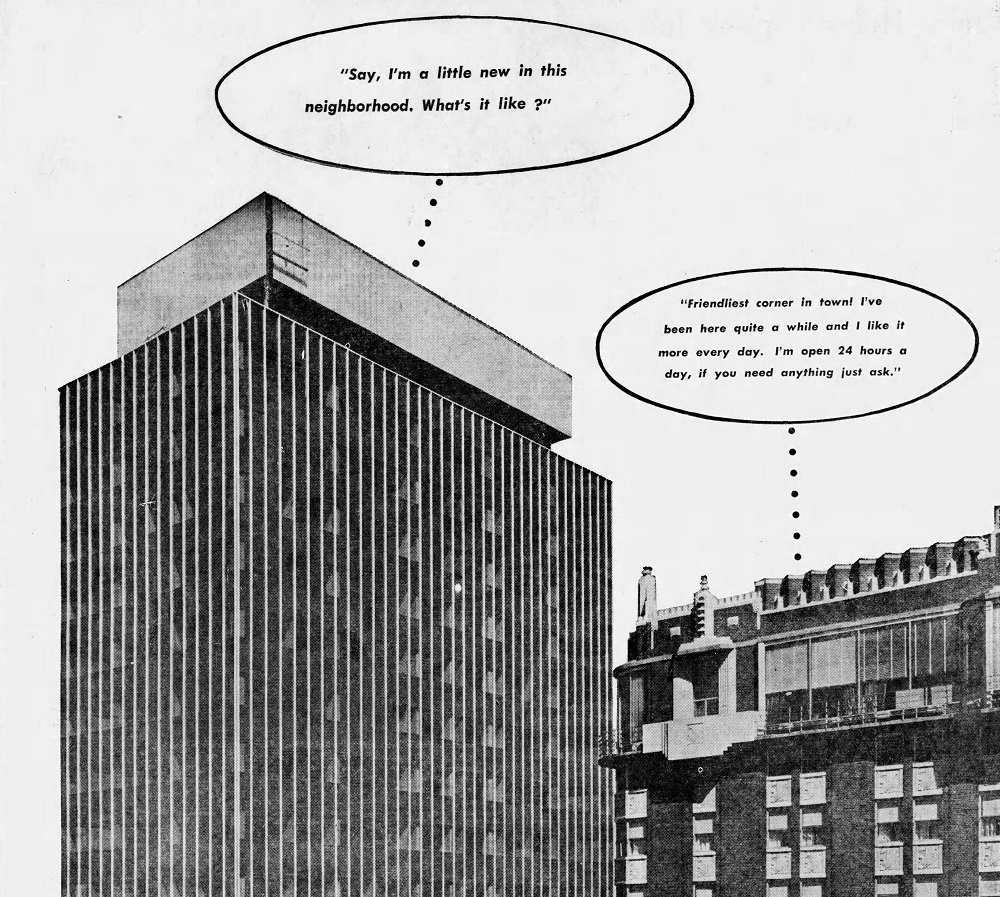 Neighborhood welcome ID: 1704 | This file appears in: First National Bank Tower The FNB tower was built across First Street from the treasured Mapes Hotel. The Mapes ran this advertisement in the newspaper to welcome its new neighbor. | Date: October 25, 1963 | Source: Reno Evening Gazette Download Original File SourceReno Evening GazetteDateOctober 25, 1963 "Neighborhood welcome" appears in: First National Bank Tower