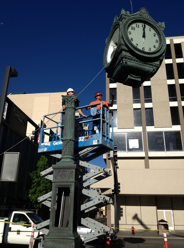 A photo documents the careful installation of the Ginsburg Clock on Reno City Plaza on January 17, 2019, after the completion of the new Virginia Street Bridge. | Creator: Tim Healion | Date: 2019Download Original File
