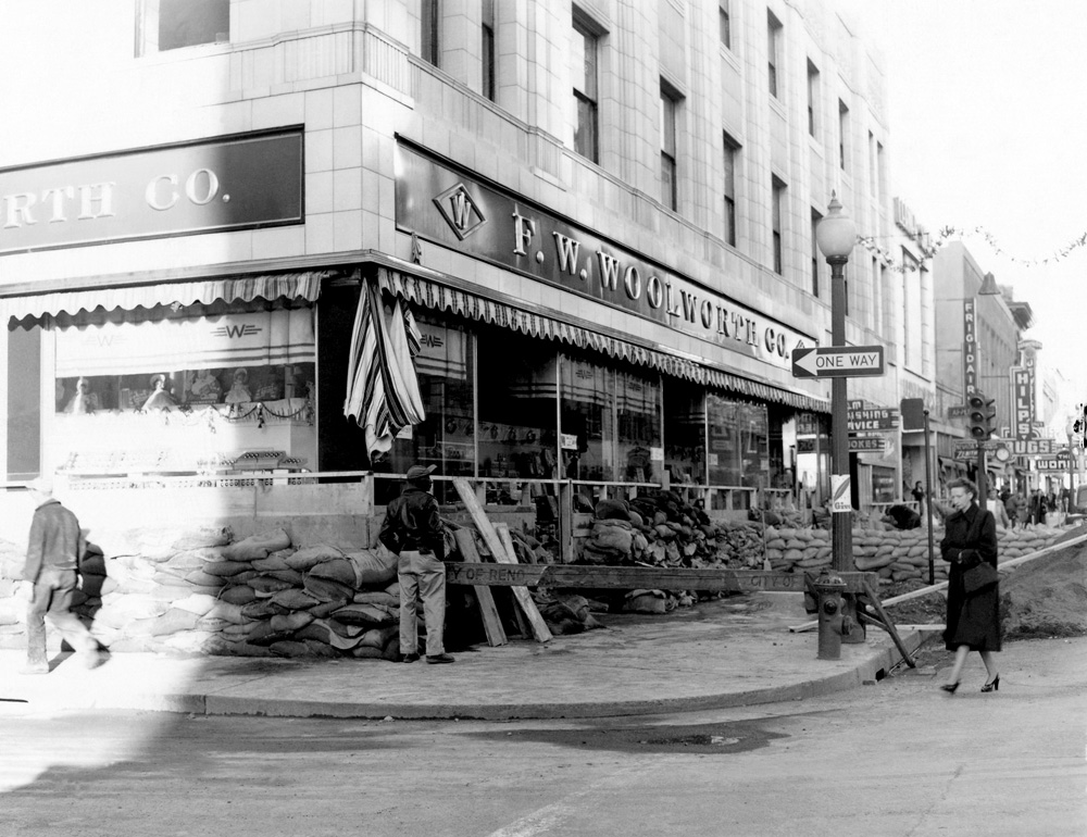 In preparation for predicted flooding in 1950, sandbags were placed around the ground floor of the Woolworth's building.