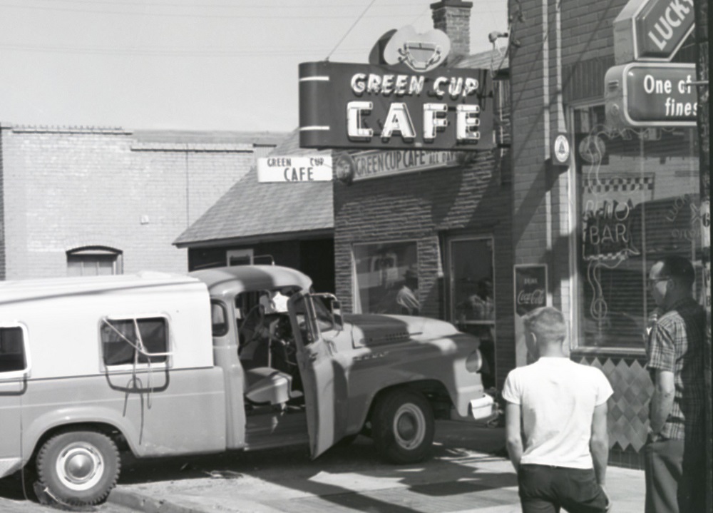 A photo taken on June 18, 1959 shows vehicles in front of the Green Cup Cafe, which was built in 1953 next to the Reno Bar (partially visible on the right). The two buildings were eventually connected on the inside.