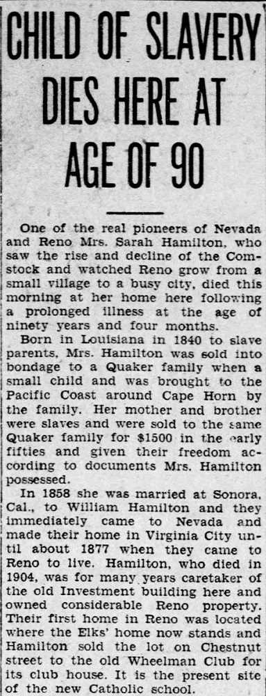 Sarah Hamilton was described as "one of the real pioneers of Nevada and Reno" upon her death in 1931 at age 90. Born into slavery in Louisiana in 1840, she lived most of her life in Nevada, where she and her husband William had prospered and left an enduring legacy behind them. | Date: May 2, 1931 | Source: Reno Evening GazetteDownload Original File