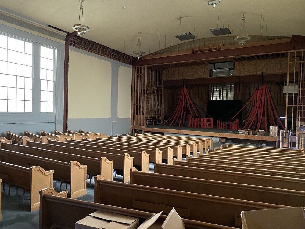 The half-completed stage ID: 2035 | This file appears in: First Church of Christ, Scientist A view from the rear of the sanctuary shows the half-completed stage area. | Creator: Alicia Barber | Date: 2021 Download Original File CreatorAlicia BarberDate2021 "The half-completed stage" appears in: First Church of Christ, Scientist