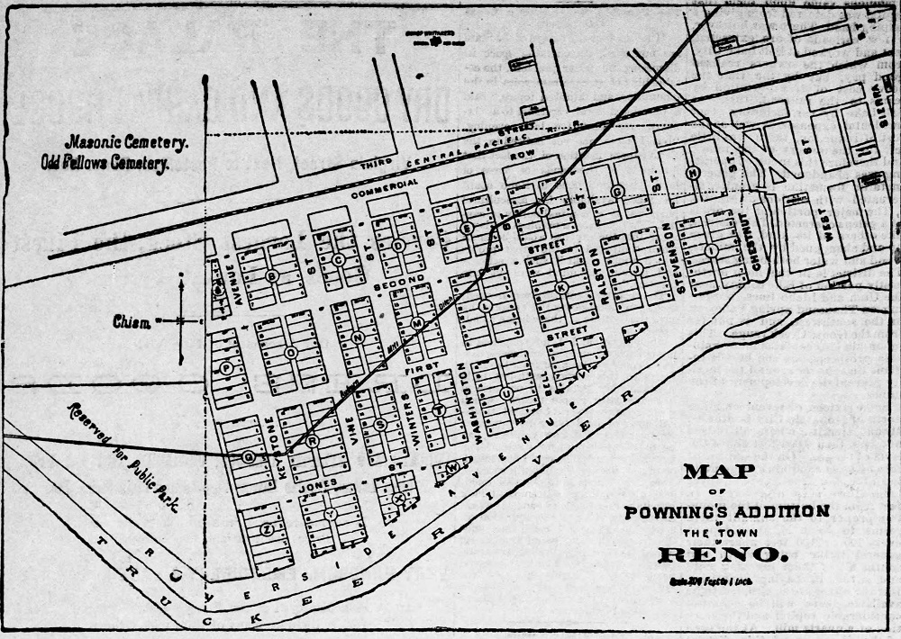 Chism Property in 1888 ID: 2040 | This file appears in: Chism Ranch A map advertising C.C. Powning's new addition to Reno in 1888 shows the location of the Chism property just to the west of the new tract on the other side of Keystone Avenue. | Date: July 24, 1888 | Source: Reno Evening Gazette Download Original File SourceReno Evening GazetteDateJuly 24, 1888 "Chism Property in 1888" appears in: Chism Ranch
