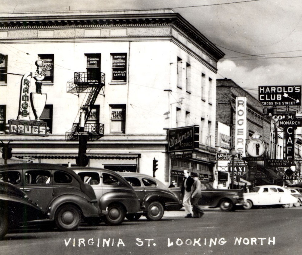 A postcard from the 1940s features a view of Virginia Street looking northward from its intersection with Second Street. The Byington Building is the white building on the far left with the Walgreen's drug store sign on the corner. | Date: ca. 1940s | Source: Special Collections, University of Nevada, Reno LibrariesDownload Original File