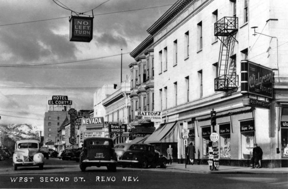 A postcard view from the 1940s looks westward along West Second Street toward the El Cortez Hotel. The second building from the right is the section constructed in 1903. Note the prominent bay windows on the second and third floors. The building was later renovated to make its exterior consistent with the original corner building. | Date: ca. 1948 | Source: Old Reno Facebook pageDownload Original File
