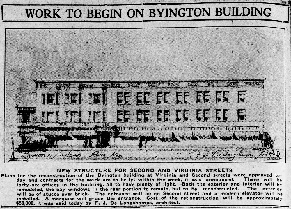 In 1926, the building underwent a major renovation, designed by prominent Nevada architect Frederic DeLongchamps, as reported in the local newspapers. The second and third floors were converted into offices. | Date: June 16, 1926 | Source: Reno Evening GazetteDownload Original File