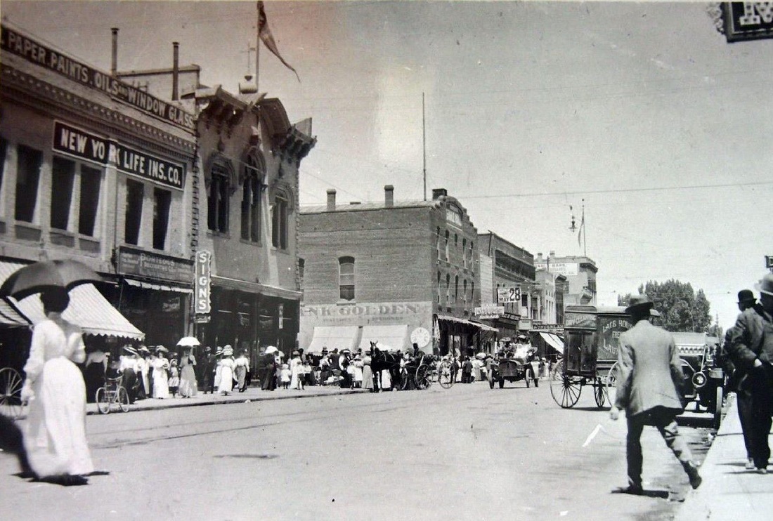 A view looking north on Virginia Street ca. 1903 shows the original section of the Byington Building in the center. The second floor windows fronted a large dance hall with a soaring ceiling that extended all the way to the roof. The painted sign reading "Golden" refers to the ground floor tenant, the Frank Golden Jewelry Co. | Source: Brian CampbellDownload Original File