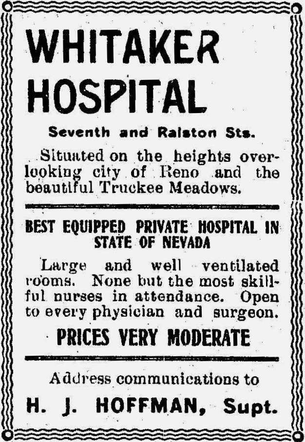 An advertisement in the Reno Evening Gazette from August 12, 1904 outlines some of the services offered by the new Whitaker Hospital, operating in the old Whitaker School building.