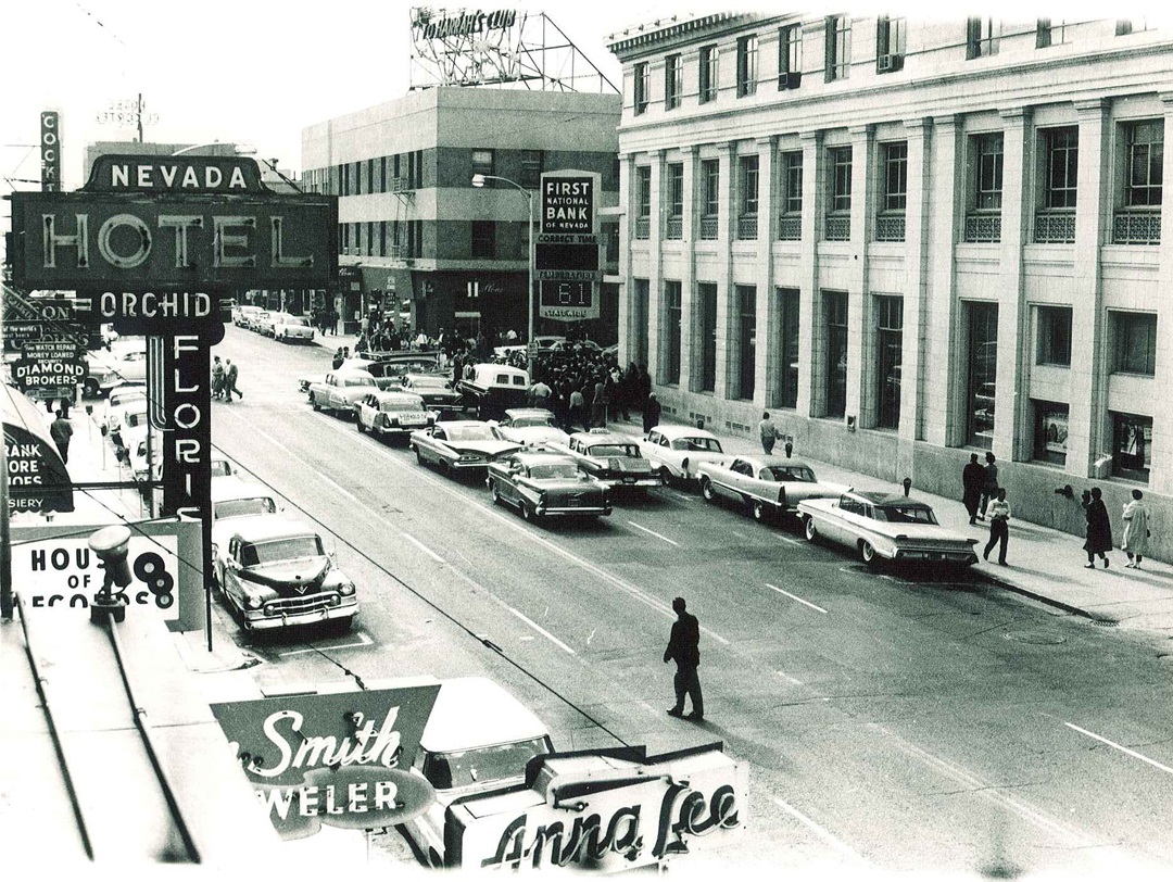 Looking west along Second Street, the Byington Building is seen in the center, just beyond the Reno National Bank building. Beginning in 1959, the Byington Building housed offices for Harrah's Club, which was located across Virginia Street, and promoted the casino with an enormous sign on the building's rooftop. | Date: ca. 1960s | Source: Brian CampbellDownload Original File