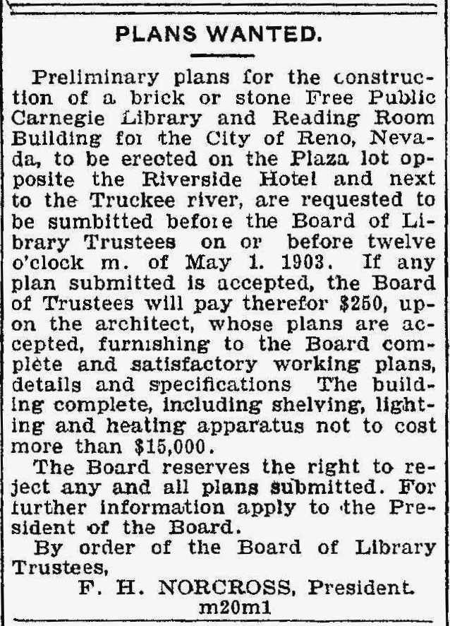 Plans wanted ID: 218 | This file appears in: Carnegie Free Public Library (site) An open call for architectural plan submissions for the proposed Carnegie Library ran in the Reno Evening Gazette in March 1903. | Date: March 20, 1903 | Source: Reno Evening Gazette Download Original File SourceReno Evening GazetteDateMarch 20, 1903 "Plans wanted " appears in: Carnegie Free Public Library (site)