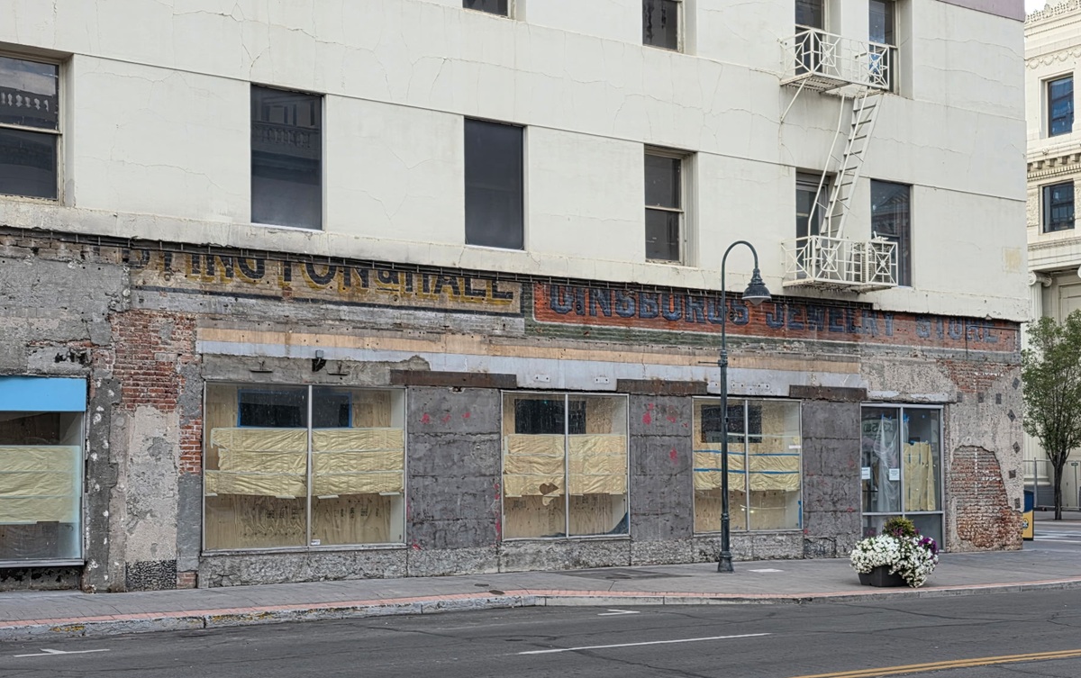 Renovations of the Byington Building in 2025 uncovered painted signage for the Ginsburg Jewelry Store, which occupied the ground floor from 1915 to 1920, and another with the Byington name and reference to the social hall on the second floor, along with building's original brick. | Creator: Bradley Carlson | Date: 2025Download Original File