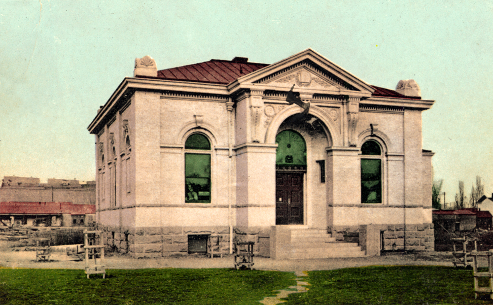 A hand-tinted postcard of the new library depicts a vibrant lawn and freshly-planted saplings. | Source: Special Collections, University of Nevada, Reno Libraries Download Original File