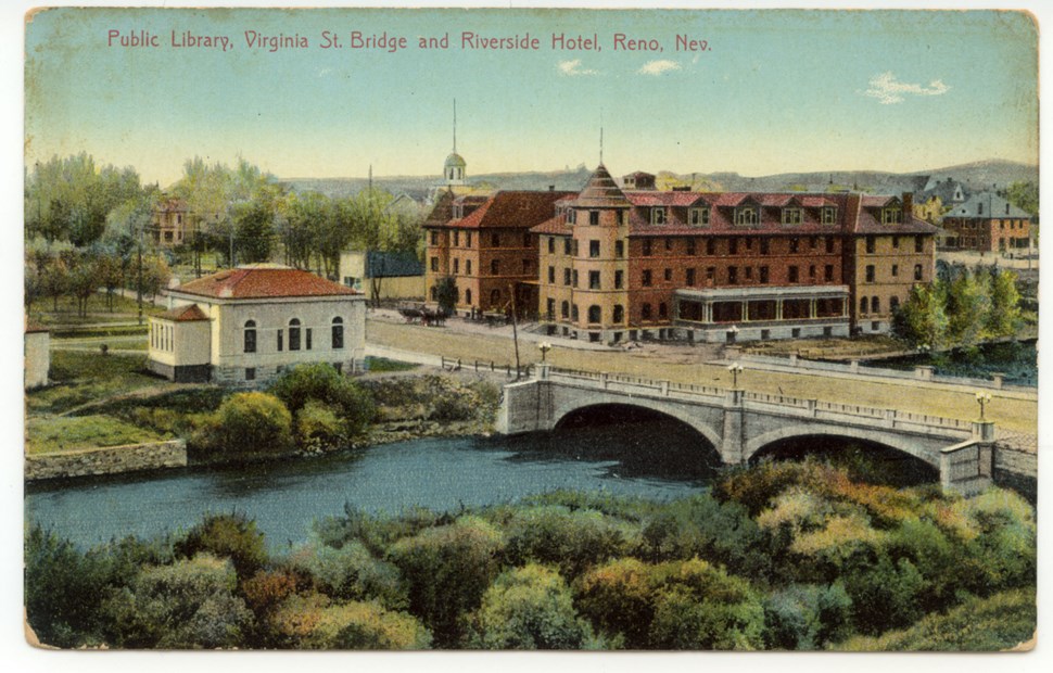 Architectural achievements ID: 223 | This file appears in: Carnegie Free Public Library (site) The Carnegie Library, new Riverside Hotel, and Virginia Street Bridge, viewed here from the river's north bank, were all completed within a two-year period between 1904-1906. | Source: Neal Cobb Download Original File SourceNeal Cobb "Architectural achievements " appears in: Carnegie Free Public Library (site)
