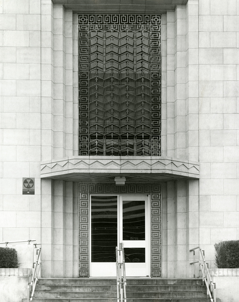 The Reno Downtown Post Office is lavishly decorated in Art Deco detail. This view of the southwest entrance shows the intricate aluminum grille work.