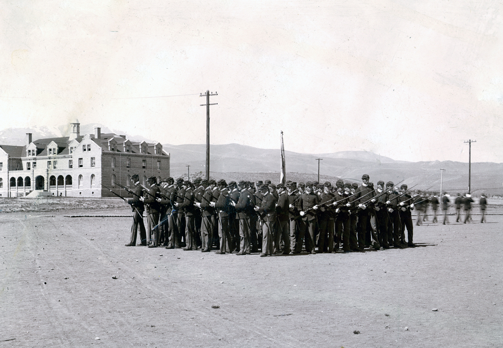 Nevada State University Cadet Corps in formation and marching, 1900. Lincoln Hall is in the background.