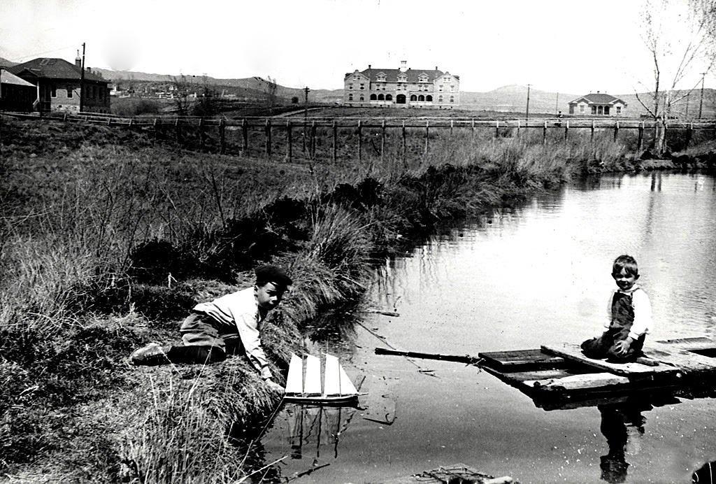 In 1905 two boys play on the University Pond, which became Manzanita Lake when a dam was built in 1912, Lincoln Hall in the background. | Date: 1905 | Source: University Archives, University of Nevada, Reno LibrariesDownload Original File