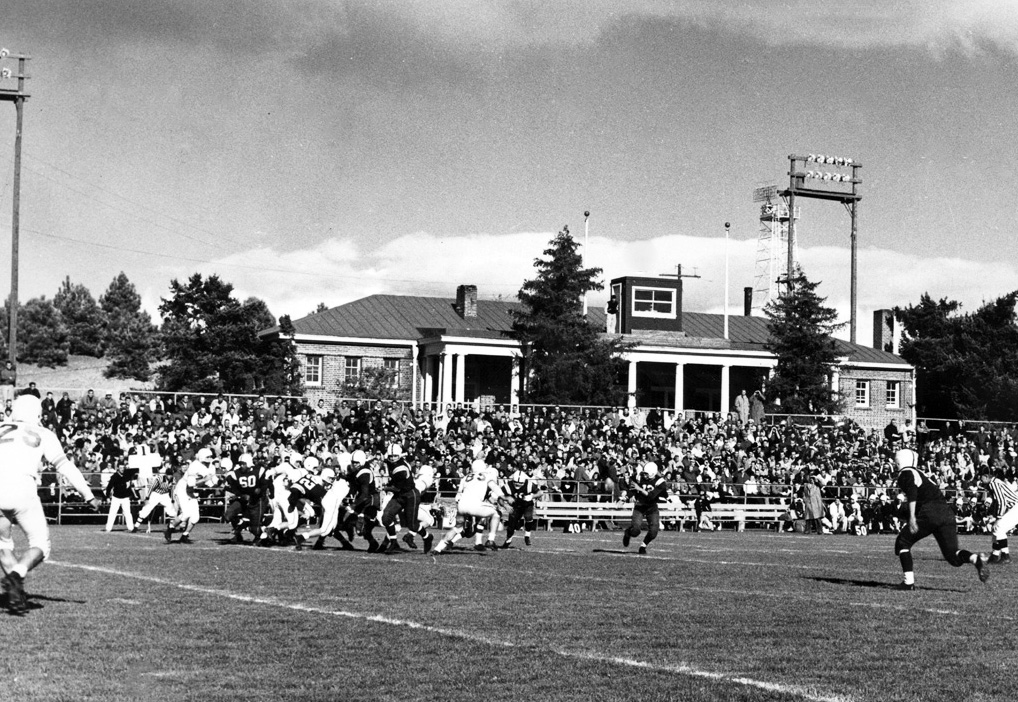 Football ID: 638 | This file appears in: Mackay Field and Stadium Football with the Mackay Training Quarters in the background in 1952. | Date: 1952 | Source: University Archives, University of Nevada, Reno Libraries Download Original File SourceUniversity Archives, University of Nevada, Reno LibrariesDate1952 "Football" appears in: Mackay Field and Stadium