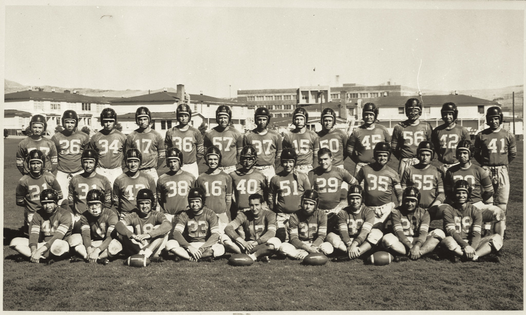 University of Nevada football Wolf Pack opens its 1954 season entertaining the San Francisco State Gators at Mackay Stadium. Members of the squad are, top row, left to right; Bob Ferrari, John Mayerhoff, Buddy Piazzo, Jim Wittenberg, Bill Howton, Walt Ryals, Dick Bankofier, George Ball, Jim Thornton, Chuck Harrison, Phil Hatch, Jack Hogan, Mike Marfisi. Middle row, left to right are: Feffler, John Scrivani, Ed Jesse, Frank Sullivan, Otis Blankenship, Dave Ryan, Jim Fast, Mike Leslie, Jerry Booth, Joe Viani, Boyce Ford. Bottom row, left to right; Lee Schroder, Ken Fujii, Bob Litton, Jim Chapman, Frank Garcia, Jim Baker, George Mross, Floyd Justus and Jim Wright.