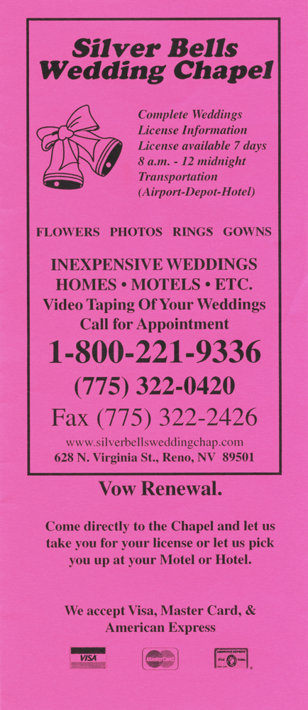 A publicity flyer ID: 75 | This file appears in: Silver Bells Wedding Chapel (site) Reno's chapels offered inexpensive yet tasteful weddings on short notice. | Source: Nevada Historical Society Download Original File SourceNevada Historical Society "A publicity flyer" appears in: Silver Bells Wedding Chapel (site)