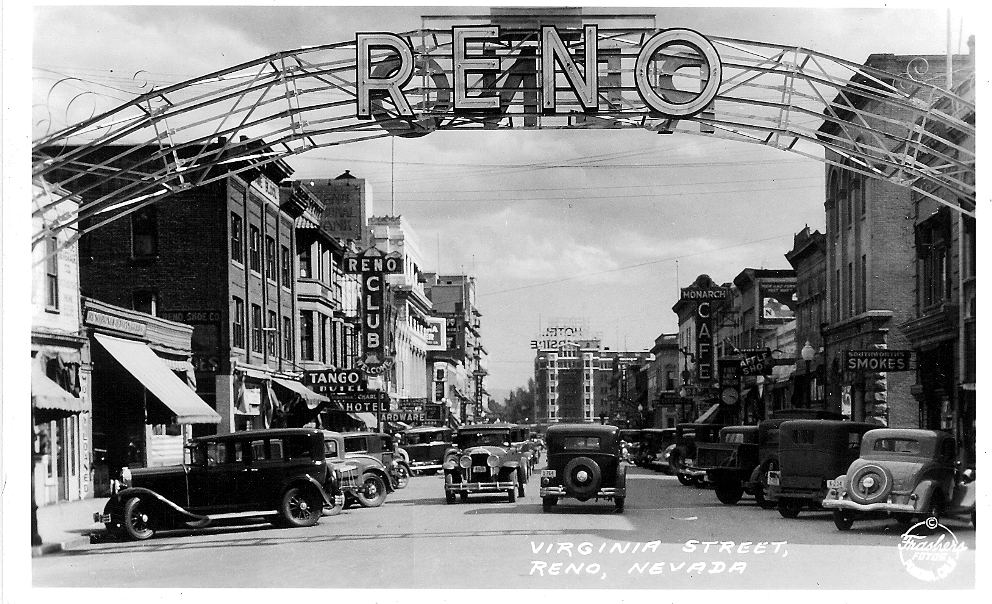 Missing slogan ID: 939 | This file appears in: Historic Reno Arch With an upgrade to neon, the arch was briefly without its famous slogan, which had been deemed outdated. After public protest, the slogan was returned to the arch on June 12, 1935. | Date: ca. 1935 | Source: Dick Dreiling Download Original File SourceDick Dreiling Dateca. 1935 "Missing slogan" appears in: Historic Reno Arch