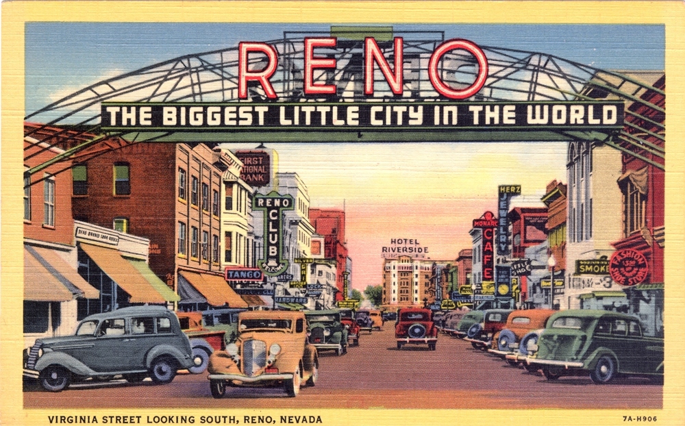 Reno icon A colorized postcard looking southward from the Reno arch captures the vibrancy of Virginia Street in the 1930s. Straight ahead is the Riverside Hotel, located on the south bank of the Truckee River. Source: Philip Galbraith Date: 1930s