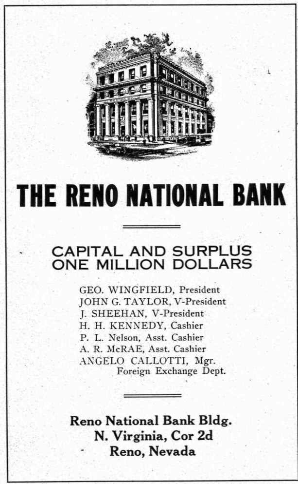 Wingfield had made his mark in the gold booms of Tonopah and Goldfield, and with his partner, U.S. Senator George Nixon, had established a financial and mining empire. In 1908, the two men moved to Reno, where Wingfield invested his money in livestock, hotels, real estate, and a chain of twelve banks. The Reno National Bank was the only financial institution he constructed. In addition, Wingfield maintained his personal offices and headquarters on the building's second floor, widely known as "the cave."