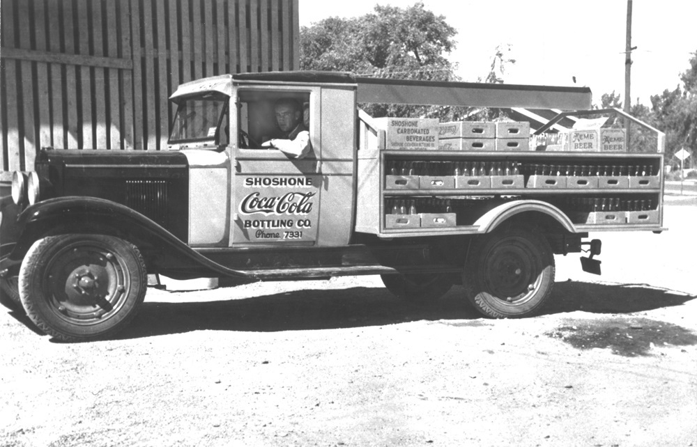 Delivery truck, 1930s A Shoshone Coca-Cola Bottling Company delivery truck carries a load of carbonated beverages, Acme Beer, and other beverages distributed by the company. Source: Nevada Historical Society Date: 1930s