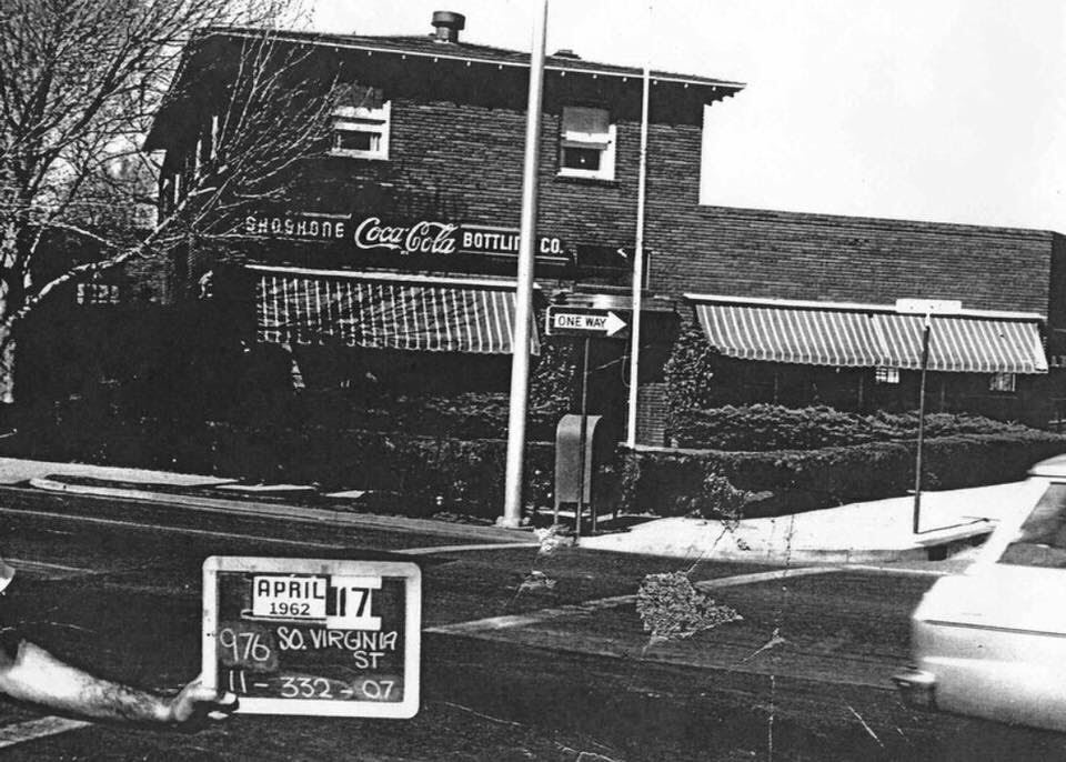 Charming corner, 1962 A photo taken for the Washoe County Assessor in 1962 shows the mature trees and meticulously landscaped hedges in front of the Coca-Cola building. Source: Nevada Historical Society Date: 1962