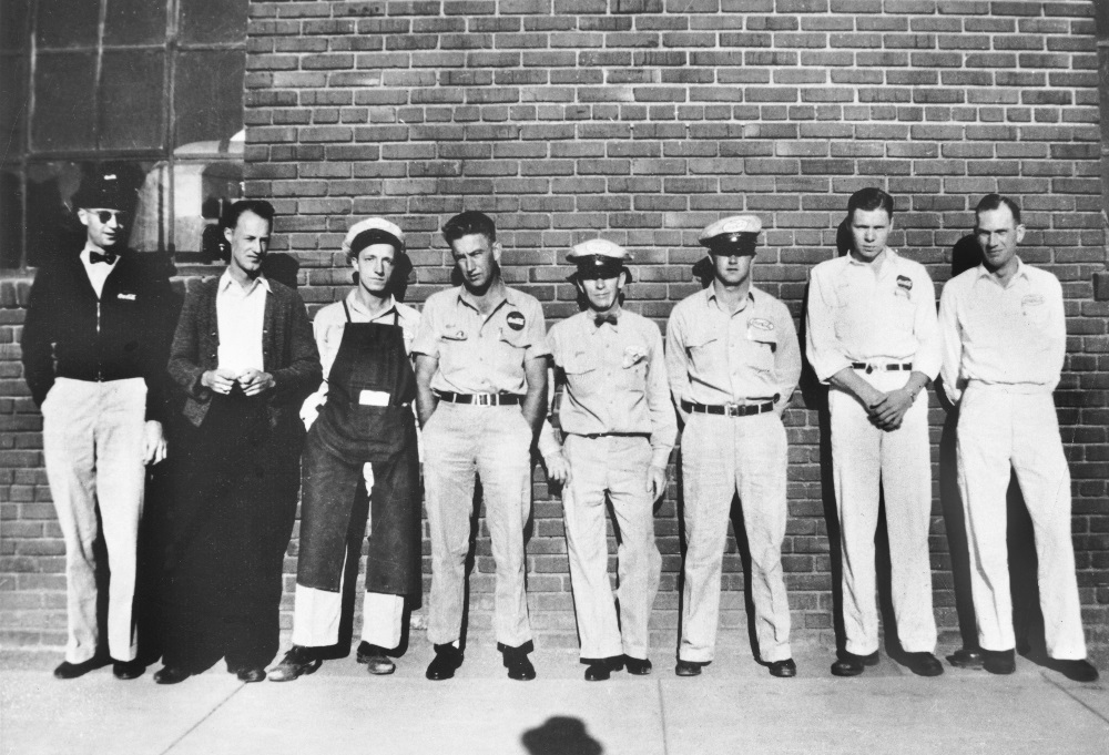 Employees, 1930s A row of employees stands outside the bottling company in 1938. Second from the left is Curtis Farr, son of company founder Leslie Farr. Source: Nevada Historical Society Date: 1930s