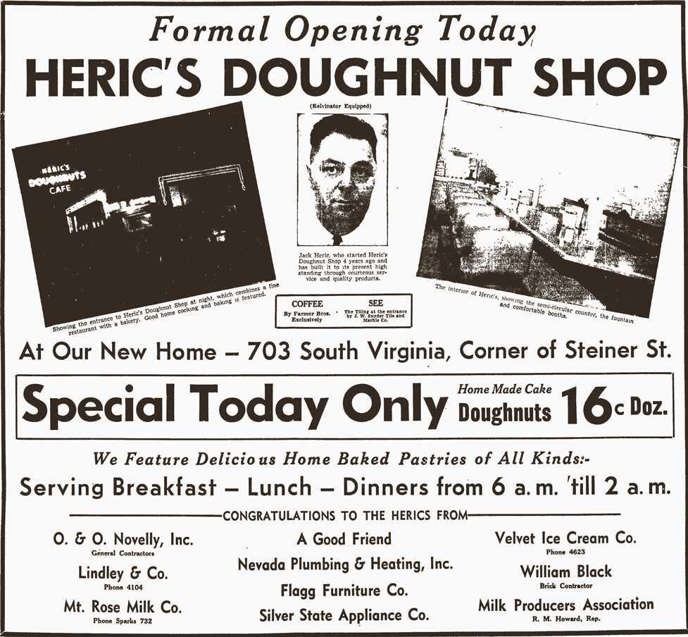 That same year, Sewell’s moved out, to a new building constructed at 445 South Virginia. Taking its place here was the Mount Rose Market, which eventually built a rear addition for selling appliances. The market closed in the late fifties, as large supermarkets began to push independent groceries out of business. Heric retired in the mid-sixties, closing his café and moving to Arizona.