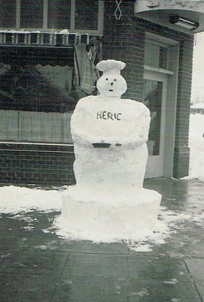 Big changes came to the intersection in 1941. The old Stiner house on the corner had been moved in order to widen Steiner Street, and a new building was constructed on the north side of the grocery, financed by Dr. Albert DaCosta. In March 1941, it opened as Heric’s Doughnut Shop (really a full café). The new addition largely matched the appearance of the original brick building, with a few distinct touches—most notably, the beautiful black and red tile beneath the large plate glass windows flanking the corner entrance.