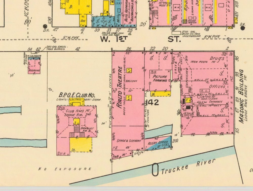 Originally, a beautiful park-like lawn area filled with mature trees stretched from the building's entrance northward to First Street. In 1937, Sierra Construction Company, owned by Norman Biltz and Dr. Theodore Chase, purchased the park area and had all the towering trees as well as the building's lovely columned portico removed so they could construct a two-story modern mercantile building with a full basement in front of the Elks Home. A new entrance to the Elks was created on Sierra Street. In 1938, the Gray-Reid-Wright department store moved into the neighboring commercial building.