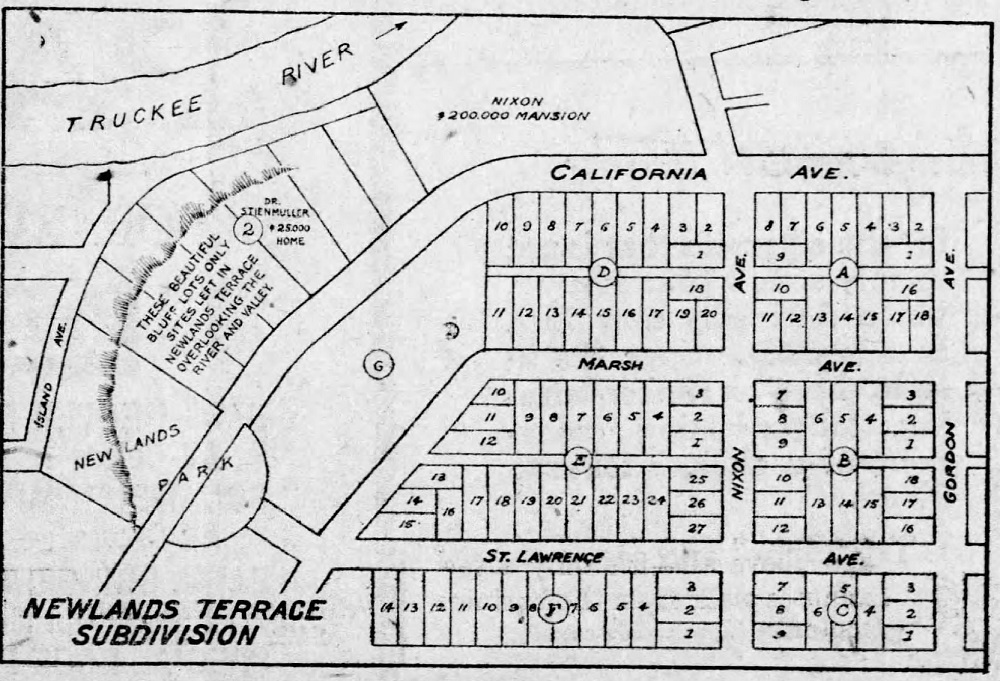 According to George Steinmiller’s granddaughter Alice Parsons, “He wanted to be a big fish in a little pond. That is why he came to Reno from Sacramento.” George Steinmiller practiced dentistry in Reno for fifty years. He and his wife Alice purchased the parcel at 761 California Avenue from the Newlands Company. It was reported at that time they spent $12,000 to build their spacious home, which was completed in 1920 or 1921. “It stood there at the western edge of the ridge,” Alice Parsons said. “My grandmother came from the east coast so the family often spent summers there and rented out the house.” One summer a tenant by the name of Jack Dempsey put up a sparring ring in the side yard.