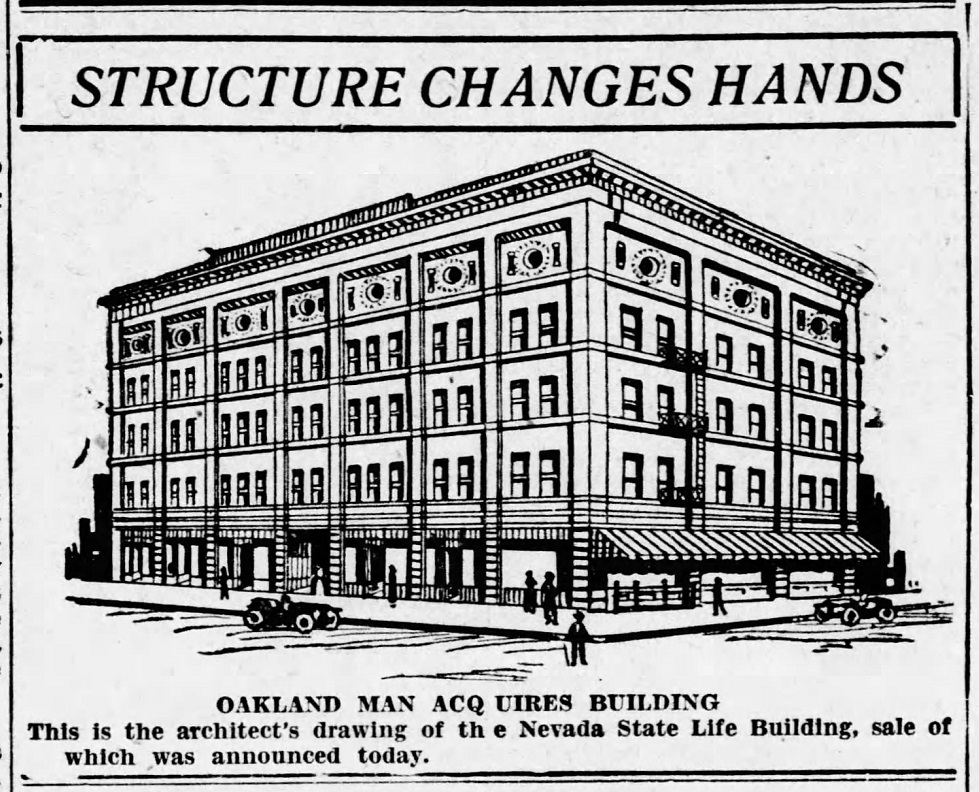 Changing Hands, 1928 The building changed hands several times in the 1920s. The acquisition of the building in 1928 by E.C. Lyons gave the structure a new name. The prominent corner spot was at the time occupied by the Scheeline Banking and Trust Company. Source: Reno Evening Gazette Date: December 22, 1928