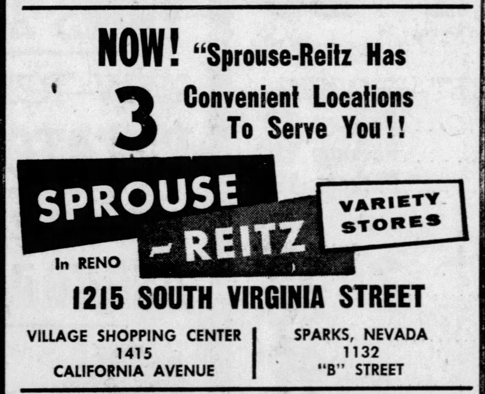 The Sprouse-Reitz company was founded in Tacoma, Washington in 1909 by John A. and Robert A. Sprouse and Fred L. Reitz, and eventually grew into a chain of more than 470 five-and-dime stores across the western United States. Reno eventually had two other branches: one in the Village Shopping Center on California Avenue (opened in 1955). and another in the Plaza Shopping Center at West 4th and Vine Streets (opened in 1957).