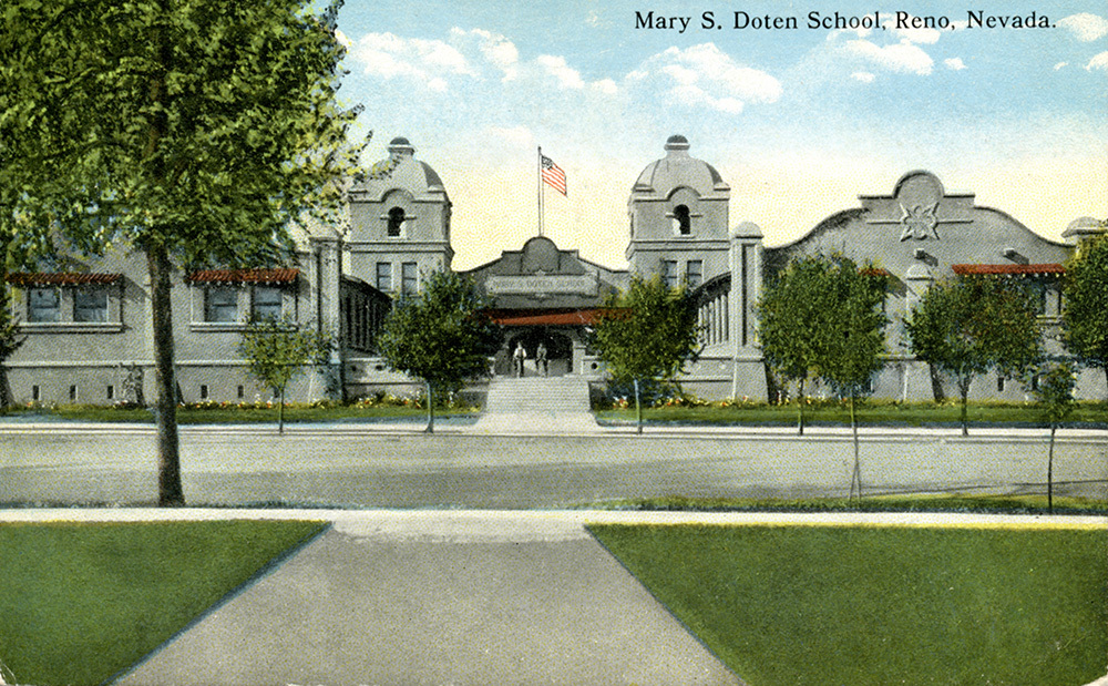 Mary S. Doten School served the students of northwest Reno for 60 years. The school was named for Mary S. Doten, a pioneer in Nevada education who had passed away in 1914. Doten began teaching in Reno in 1883, but before that, as a young woman, she had come to the Comstock boomtown of Virginia City from her home in Connecticut. There, she met the newspaperman Alf Doten, a friend of Mark Twain. Mary and Alf married in a romantic ceremony on a boat in Lake Tahoe in 1873.