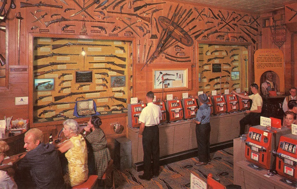 In 1949 Harolds Club expanded again and opened the Roaring Camp Room, full of more western memorabilia including hundreds of historic firearms. In 1949 the Smith family hired artist Theodore McFall to design the famous mural that adorned the club's Virginia Street facade for the next fifty years. Like the club's interior decor, the mural capitalized on the popularity of stereotypical depictions of cowboys, pioneers, Indians, and the West that dominated American culture at the time. Harolds Club was also known worldwide for its groundbreaking marketing slogan, "Harolds Club or Bust," which at its height blazed across more than 2,300 billboards across the United States and selected locations worldwide.