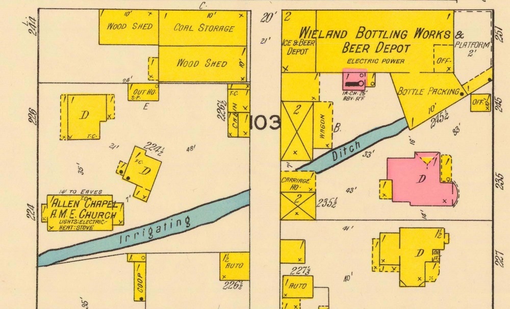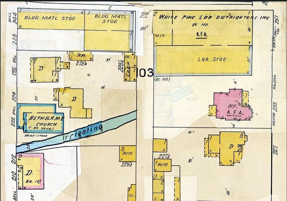 In 1900, he bought this plot of land in the Powning Addition at an auction for $488.75 and in 1904 had it officially declared as a homestead. Bell Street had very few homes at the time. His property ran along the north side of the Auburn, or English Mill irrigation ditch. William died less than a month after filing the homestead papers, and was buried in Hillside Cemetery. An obituary referred to "Uncle Billy" as one of the oldest residents of the state, “known to all the pioneers," who left behind an estate of $3300, a sizable amount for the time. Now a widow, Sarah Hamilton sold the southernmost forty feet of their Bell Street property to the congregation of the Bethel AME Church in 1910. The Hamiltons’ wood frame house was moved to the north end of the lot in order to make way for the church to face the street. That left two houses and a cabin on the Hamilton property, where Sarah continued to live.