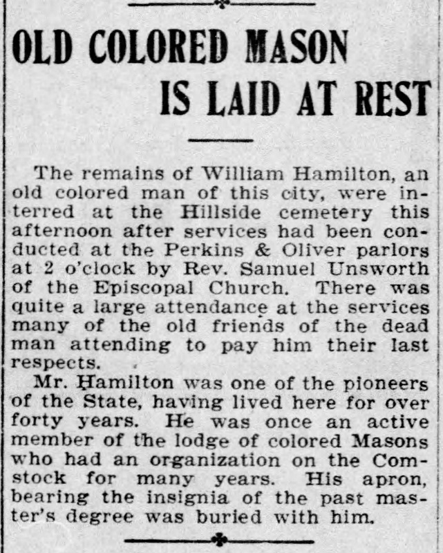 William and his wife Sarah were two of the earliest Black residents of Nevada. William was born in Washington, DC around 1832, while Sarah was born into slavery in Louisiana in 1840. While little is known of William’s early years, Sarah and her mother and brother were said to have been sold in Louisiana to a Quaker family who brought them to the Pacific Coast where they were freed. William and Sarah reportedly married in Sonora, California in 1858 and moved to Virginia City soon after the momentous discovery of the Comstock Lode in 1859. There, William became one of the first members of Virginia City’s Black Masonic Ashlar Lodge No. 9.
