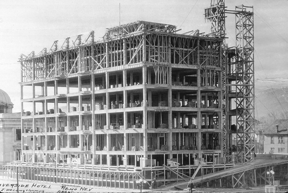 Unable to rebuild, Gosse sold the vacant lot for $70,000 to Reno’s most powerful citizen, George Wingfield. The wealthy banker hired prominent architect Frederic DeLongchamps to design a luxury hotel deliberately courting well-to-do divorce-seekers and other travelers. Gothic in style and fully appointed throughout, the stately new six-story Riverside Hotel opened on May 14, 1927.